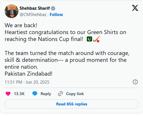 The PM, known for tweeting in multiple languages, congratulated the team on their semi-final win over France in the FIH Nations Cup. “Heartfelt congratulations to the national hockey team for reaching the final of the Nations Cup. Pakistani team turned the tide of the match with courage, skill, and determination—this is a proud moment for the entire nation. Pakistan Zindabad!” he wrote on X (formerly Twitter).