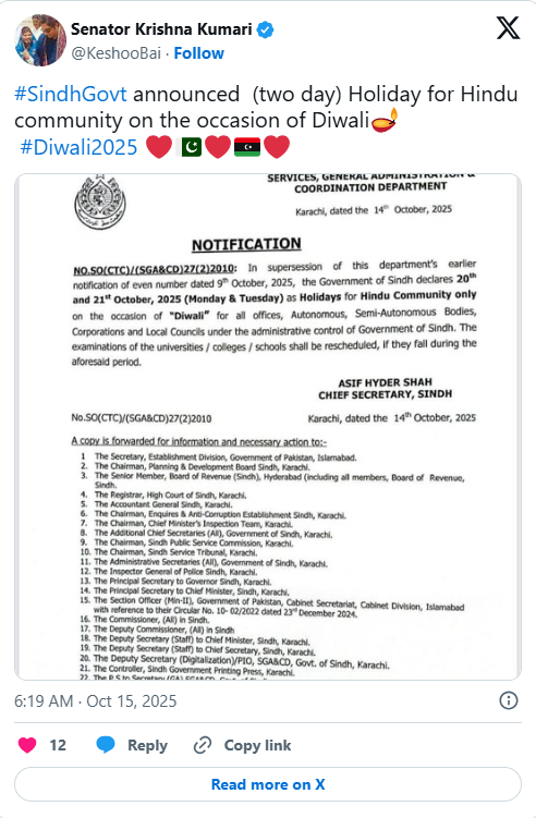 The Sindh government has announced a two-day holiday on October 20 and 21 to mark the Hindu festival of Diwali. According to a notification issued by the provincial Department of Services, General Administration, and Coordination, the holidays will apply exclusively to Hindu employees working in government departments.